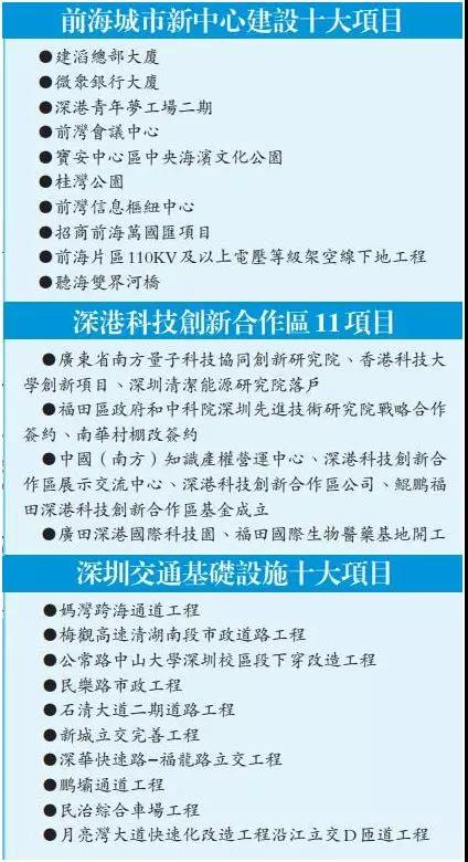 在31个项目中,前海城市新中心建设项目10个,包含了产业、公建、环境提升以及市政基础设施等类型;深港科技创新合作区项目11个,分为落户、签约、启动和建设四类;深圳交通基础设施项目10个。