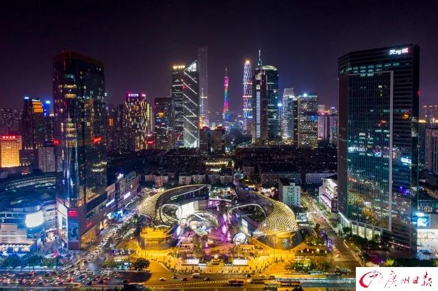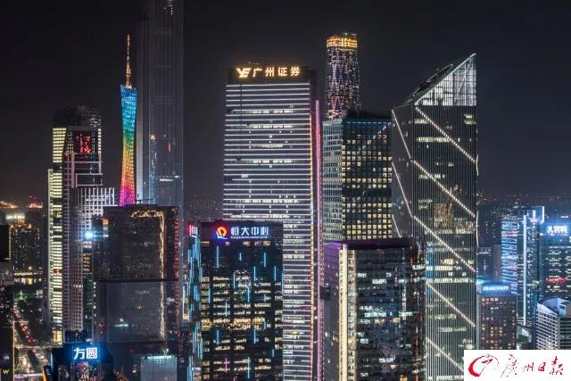 2017《财富》全球论坛广州塔晚宴,亿航无人机在空中组成财富字样。广州日报全媒体记者 苏俊杰 摄珠江新城CBD建筑群。广州日报全媒体记者 莫伟浓摄