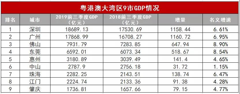 不过2019年前三季度,大湾区9市中佛山、东莞的GDP名义增速超过8%,是一大亮点。