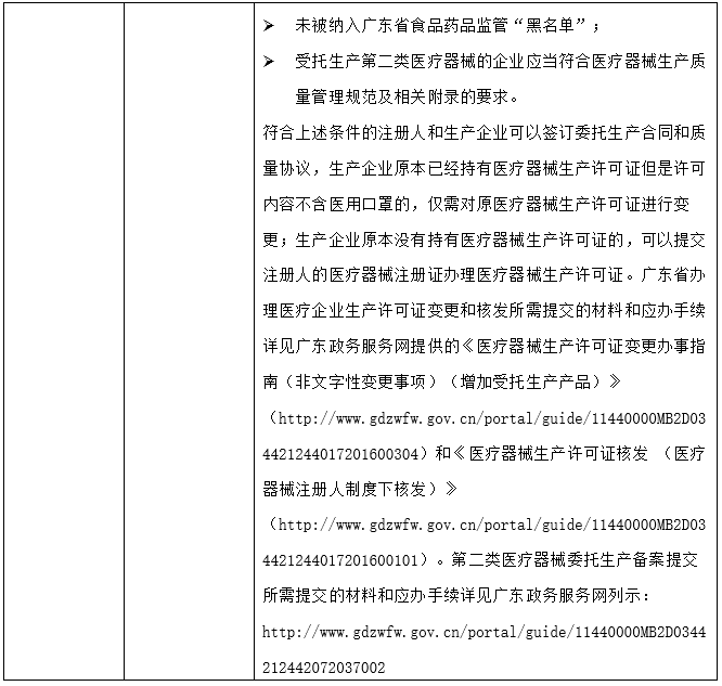 对于仅在疫情期间临时转产,疫情结束后将复产的企业,广东省亦有相关政策支持。笔者经电话咨询广东省药监局,该局已在疫情防控期间下发《广东省药品监督管理局办公室关于重大突发公共卫生事件一级响应期间对医用口罩等防控急需用器械实施特殊管理的通知》(粤药监办许〔2020〕39号)和《广东省药品监督管理局办公室关于一级响应期间对医用口罩等防控急需用品实施特殊管理的补充通知》(粤药监办许〔2020〕42号),虽然上述文件均为内部文件,笔者无法查看,但根据广东省药监局工作人员的口头回复,在一级响应期间,广东省药监局将应急医疗器械产品/生产/委托生产备案的权限下放到各市局,拟临时转产医用口罩的企业可以通过当地市级市场监督管理局进行应急医疗器械产品备案、应急医疗器械生产备案或应急医疗器械委托生产备案,以开展医用口罩的生产经营。该等应急备案仅在疫情期间有效,如转产企业在疫情结束后仍计划延续医用口罩生产的,需重新向省级药品监督管理局申请行政许可。