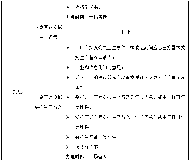 以中山为例:根据中山市市场监督管理局于1月30日发布的《中山市突发公共卫生事件一级响应期间应急医疗器械产品备案指引》、《中山市突发公共卫生事件一级响应期间应急医疗器械生产备案指引》、《中山市突发公共卫生事件一级响应期间应急医疗器械委托生产备案指引》,在一级响应期间,企业临时转产医用口罩在两种经营模式下需要提交的材料及办理时限分别如下: