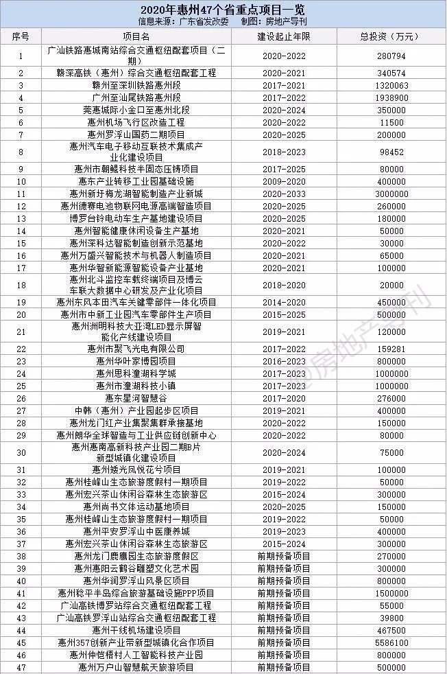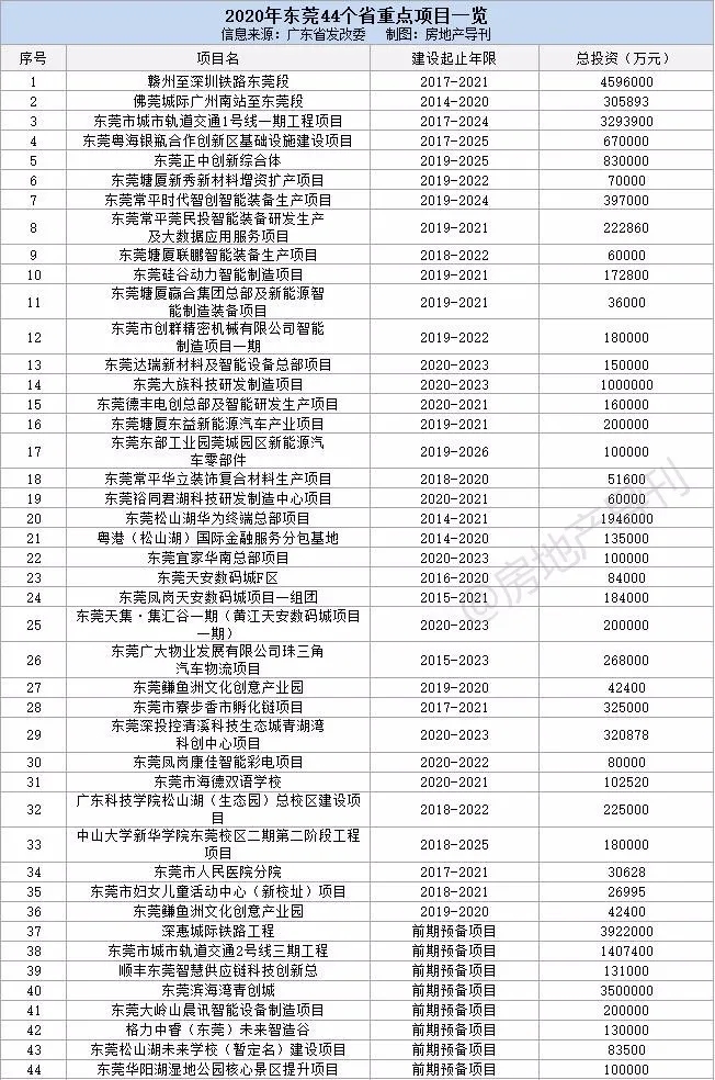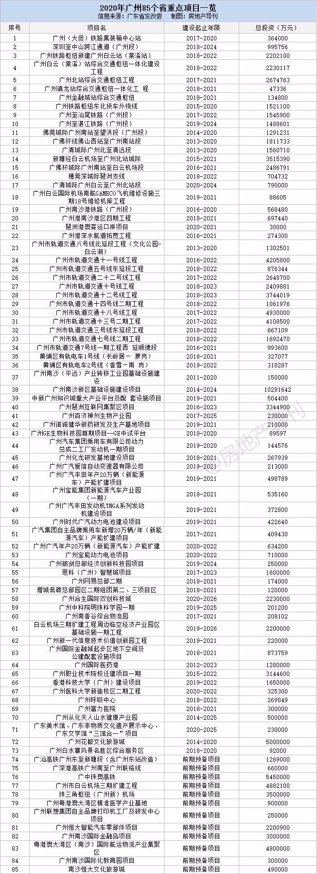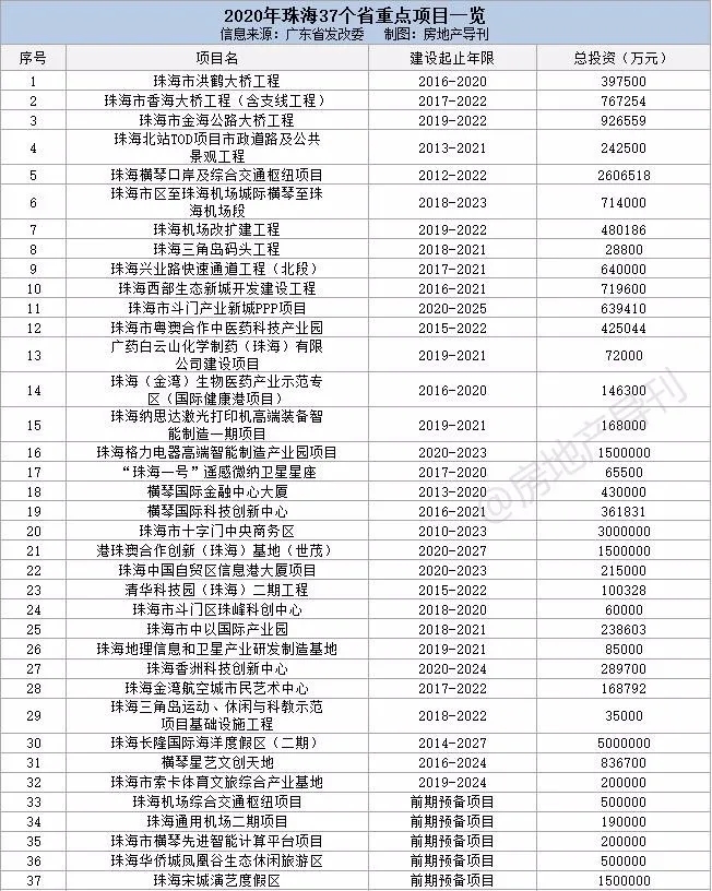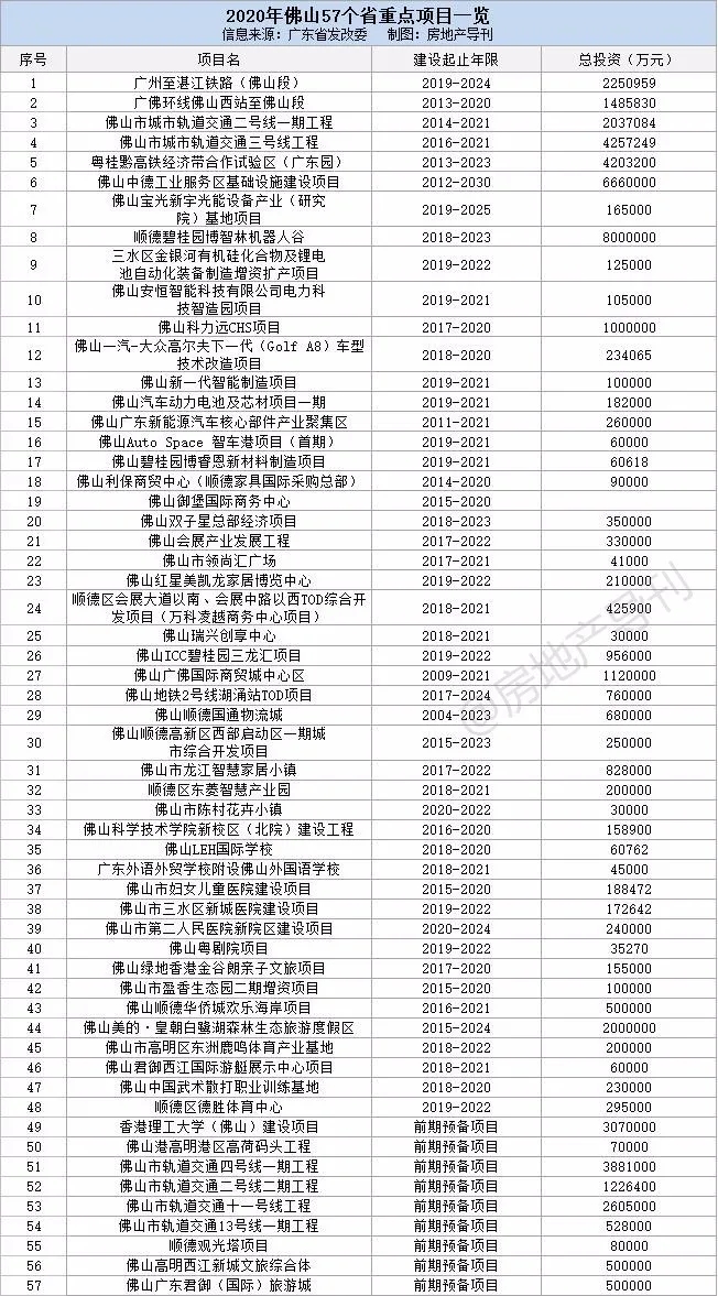 ??根据省发改委近日公布的《广东省2020年重点建设项目计划表》,我们统计了大湾区九市超400个省重点项目(不含前期预备项目),这些项目涉及轨道交通、市政民生、产业建设、教育医疗、文化旅游等方方面面,总投资超2.79万亿元,建设年限2至5年不等。