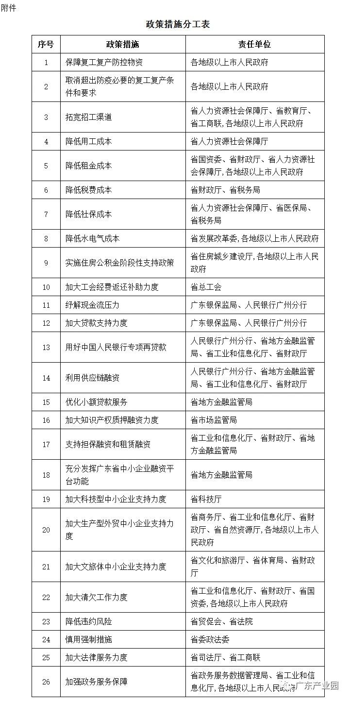 各地级以上市党委和人民政府,省委各部委,省直各单位,省各人民团体,省法院,省检察院,中直驻粤各单位: 《关于应对疫情影响加大对中小企业支持力度的若干政策措施》已经省委、省政府同意,现印发给你们,请认真组织实施。实施过程中遇到的问题,请径向省工业和信息化厅反映。关于应对疫情影响加大对中小企业支持力度的若干政策措施 为深入贯彻习近平总书记重要讲话和重要指示批示精神,统筹推进新冠肺炎疫情防控和经济社会发展工作,支持我省中小企业应对疫情影响,保持平稳健康发展,现制定以下政策措施。 1.保障复工复产防控物资。各地要加强口罩、防护服、消毒用品、测温仪等防控物资的市场供应,保障中小企业的防控物资需求。鼓励有条件的地市集中采购防控物资向中小企业提供。 2.取消超出防疫必要的复工复产条件和要求。各地不得对中小企业复工复产设置歧视性条件,不得擅自下发推迟企业复工时间的文件,要立即对本地出台的不合理限制性措施进行修订和清理,取消超出防疫必要、不切实际的复工条件和要求,尽快推动中小企业复工复产。 3.拓宽招工渠道。鼓励企业和行业协会、商会“点对点”组织专车、专列等方式帮助异地务工人员返粤返岗,各地可给予一定补助。实施线上“南粤春暖”活动,引导劳动者选择网上服务平台、微信公众号等非接触式途径,确保求职就业不停歇。对生产、配送疫情防控急需物资,在疫情防控期间新招用员工的企业,按每人不超过1000元标准给予一次性吸纳就业补助。人力资源服务机构为重点用工企业、高新技术企业介绍员工,符合条件的可按每人400元标准给予职业介绍补贴。 4.降低用工成本。对不裁员、少减员的企业返还失业保险费,按企业及其职工上年度实际缴纳失业保险费总额的50%予以返还。对职工因疫情接受治疗或被医学观察隔离期间企业所支付的工资待遇,按照不超过该职工基本养老保险缴费工资基数的50%补贴企业。 5.降低租金成本。国有资产类经营用房对受疫情影响较大不能正常经营的民营承租企业免收第一个月租金,减半收取第二、三个月租金,确保减免租金落到实际经营承租户。鼓励有条件的国有单位适当延长租金减免时限。对疫情防控期间为承租的中小企业减免租金的创业孵化示范基地、示范园区,各地可给予一定运营补贴。 6.降低税费成本。疫情防控期间,准许企业延期申报纳税。对符合延期缴纳税款条件的企业,准许延长不超过3个月的税款缴纳期限。对纳税确有困难的企业,依法合理予以减免房产税、城镇土地使用税。落实好自2020年3月1日至5月31日,小规模纳税人增值税征收率由3%降至1%的政策。 7.降低社保成本。自2020年2月1日至6月30日,阶段性免征中小企业养老、失业、工伤保险单位缴费。2020年2月至6月,职工医保统筹基金累计结余可支付月数大于6个月的统筹地区,职工医保单位缴费部分可减半征收;减半征收政策结束后,符合粤府〔2020〕12号文降费条件的统筹地区,可继续执行阶段性降费政策至2021年4月30日。对受疫情影响不能按时缴纳社保费的企业,允许延期至疫情解除后3个月内缴费,期间不加收滞纳金;受疫情影响生产出现严重困难的企业,可申请缓缴社保费,缓缴执行期为2020年内,缓缴期限原则上不超过6个月,缓缴期间免收滞纳金。 8.降低水电气成本。自2020年2月1日至6月30日,督促中石油、中海油、中石化等气源供应企业执行国家政策降低气源价格;省内天然气管道运输价格下调10%;城镇燃气企业天然气购销价差下调10%;全省除高耗能行业外的工商业用户的电费统一按照原到户电价水平的95%结算;鼓励各市结合当地情况,适当下调这一期间当地非居民用水价格。 9.实施住房公积金阶段性支持政策。2020年6月30日前,企业与职工充分协商的前提下,可自愿缴存住房公积金。 10.加大工会经费返还补助力度。自2020年1月1日至2021年12月31日,对小微企业工会经费实行全额返还。对有困难的中型企业工会,县级以上工会安排专项资金予以回拨补助。 11.纾解现金流压力。对于2020年1月25日以来到期的困难中小企业贷款本金,银行业金融机构应根据企业延期还本申请,通过贷款展期、续贷等方式,给予企业一定期限的临时性延期还本安排,还本日期最长可延至2020年6月30日。对于2020年1月25日至6月30日中小企业需支付的贷款利息,银行业金融机构应根据企业延期付息申请,给予企业一定期限的延期付息安排,贷款付息日期最长可延至2020年6月30日,免收罚息。 12.加大贷款支持力度。银行业金融机构应积极对接中小企业融资需求,建立绿色通道,简化贷款审批流程,适度下放审批权限,应贷尽贷快贷。要改进绩效考评、尽职免责等内部资源配置和政策安排,努力提高小微企业信用贷款、中长期贷款占比和“首贷率”。鼓励支持国有大型银行2020年上半年普惠型小微企业贷款同比增长30%以上。 13.用好中国人民银行专项再贷款。对纳入全国性和地方性疫情防控重点保障名单的企业提供利率上限不超过一年期LPR减100个基点的优惠利率信贷支持,并通过配套的财政贴息,确保相关企业的实际融资成本降至1.6%以下。落实下调支农、支小再贷款利率0.25个百分点至2.5%的政策。 14.利用供应链融资。在全省推广政府采购项下融资业务和应收账款融资业务,鼓励政府采购管理部门、核心企业等与中征