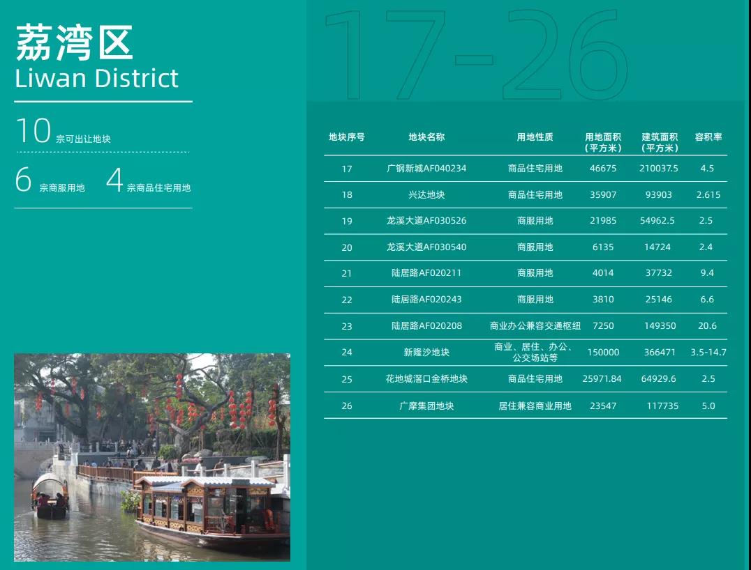 ? ? ? ?此外,今年荔湾区有4宗住宅用地,其中广钢新城的一宗宅地地块位于广钢公园南侧,位置优越。东临芳村大道、西接花地大道、北靠鹤洞路、南邻环城路。7分钟直达广州南站,距离白鹅潭商业中心2.5公里。该地块用地面积46675平方米,建筑面积210037.5平方米,容积率4.5。此外,位于白鹅潭的陆居路地块和新隆沙地块均有商服用地出让,其中,靠近芳村地铁站的一块商业办公兼容交通枢纽用地,容积率达到了20.6;紧邻珠江的新隆沙地块内的商业、居住、办公、公交站场用地的容积率最高也达到了14.7。