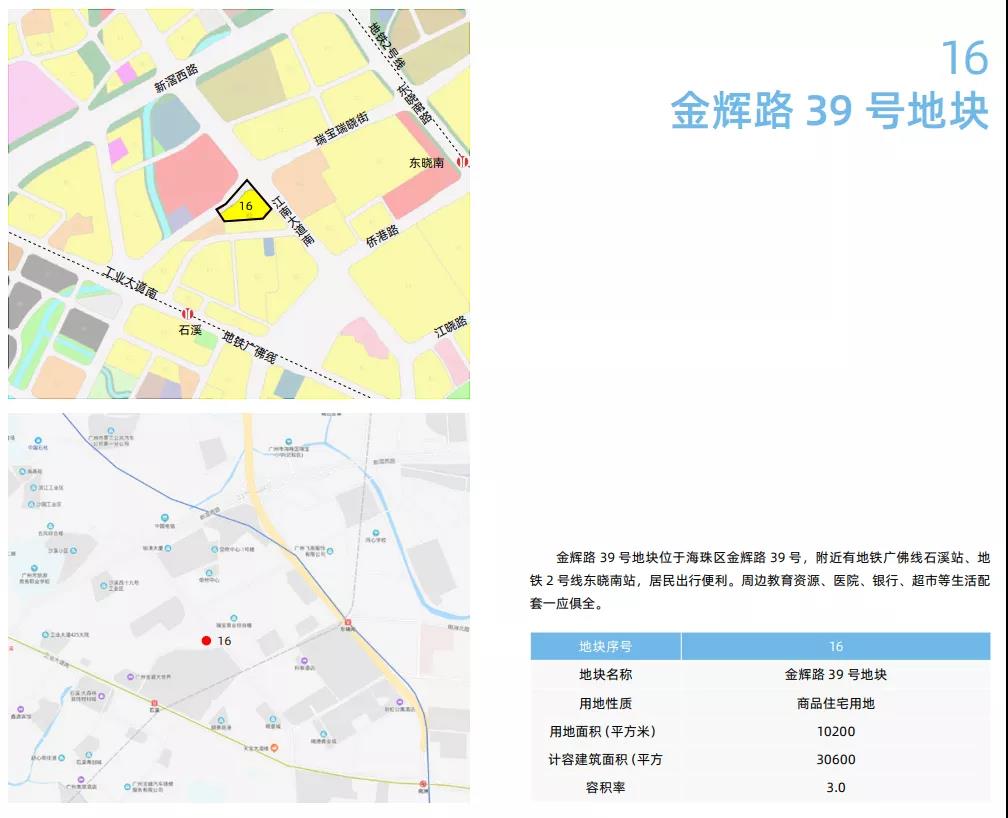 ? ? ? ?海珠区唯一的一住宅用地位于金辉路39号,附近有地铁广佛线石溪站、地铁2号线东晓南站,居民出行便利。用地面积10200平方米,计容建筑面积30600平方米,容积率3.0。