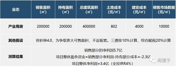 对于实体企业,逻辑类似,无非自持部分自用为主,没有招商压力,其他可售部分算账类似。