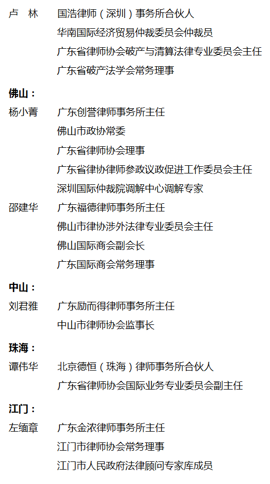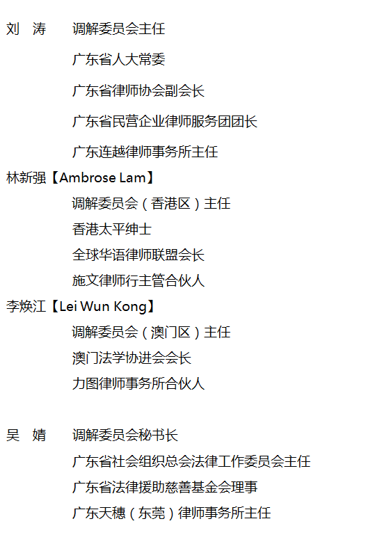 因疫企业跨境纠纷调解委员会由我会法律专业委员会负责组织日常工作与管理。广东省人大常委、广东省律师协会副会长、广东连越律师事务所主任刘涛担任主任,香港太平绅士、全球华语律师联盟会长、施文律师行主管合伙人林新强担任香港区主任,澳门法学协进会会长、力图律师事务所合伙人李焕江担任澳门区主任,广东省社会组织总会法律工作委员会主任、广东省法律援助基金会理事、广东天穗(东莞)律师事务所主任吴婧担任秘书长?;嵘?,调解委员会粤港澳三地主任分别致辞,介绍调解委员会成立初衷及今后工作方向,将不断完善制度,优化流程,善用技巧,充分发挥调解制度自愿协商、程序简易和成本低廉等优势,为大湾区企业提供法律专业服务。