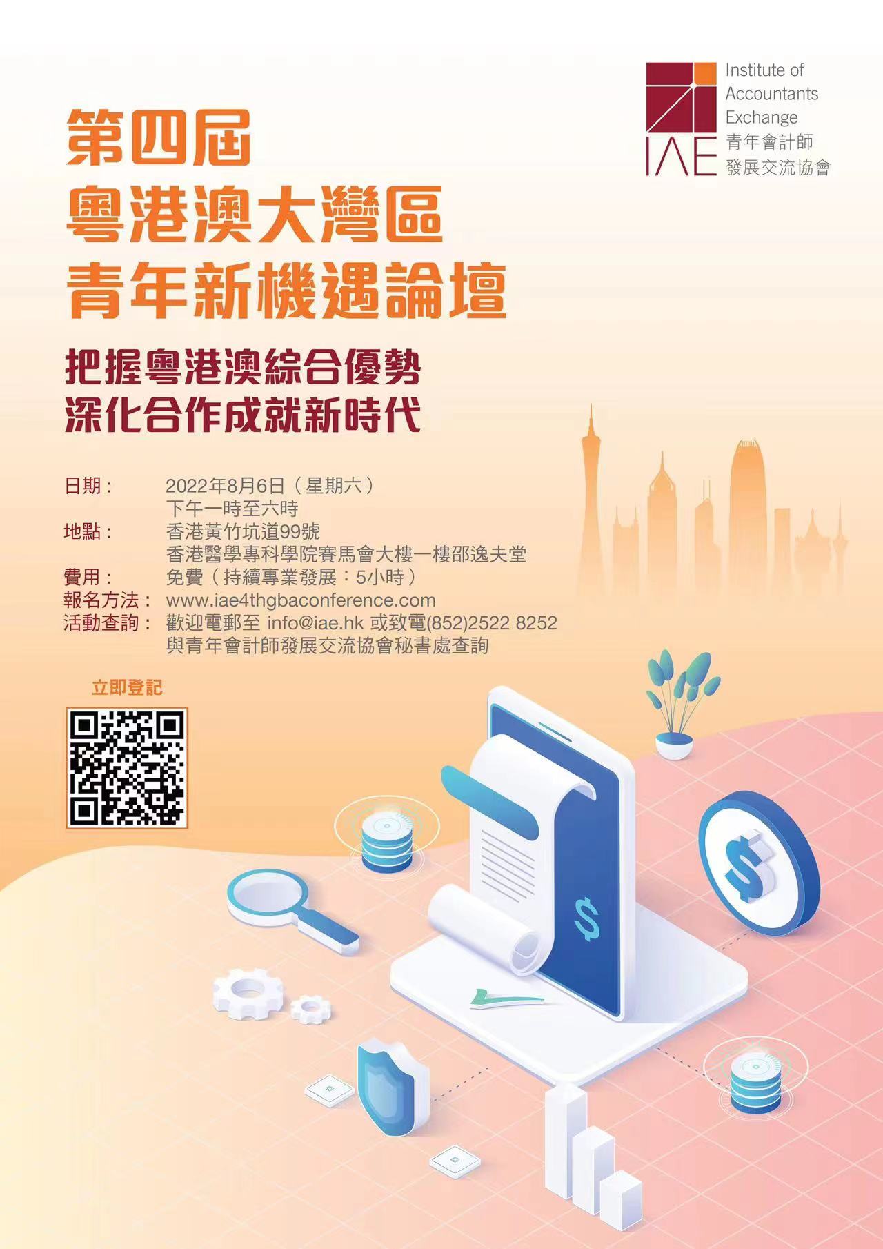 由香港青年会计师发展交流协会主办,广东省粤港澳合作促进会会计专业委员会、香港及内地多个会计师团体共同协办,以“把握粤港澳综合优势,深化合作成就新时代”为主题的第四届粤港澳大湾区青年新机遇论坛,于8月6日线上线下同步举办。论坛将汇聚香港会计界专家,一同探讨关于粤港澳大湾区对人才流动、青年发展及创业的各种机遇,以加强大湾区青年会计界的沟通与交流。