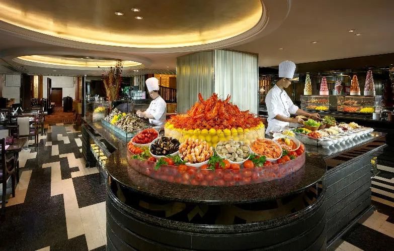 酒店二楼设有780平方米的明珠殿宴会厅, 楼高4.6米,无柱室内设计,拥有180度海景?;褂涤辛郊浜>暗牟吞?,皇厨中餐厅以粤菜为主,蓝湾西餐厅以亚洲风味为主,提供琳琅满目的地道菜式。