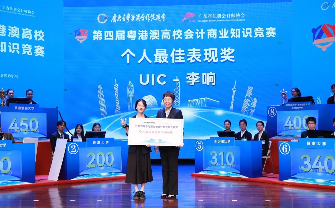 广东省审计厅二级巡视员罗洁玲为北京师范大学-香港浸会大学联合国际学院参赛队队长李响颁发个人最佳表现奖