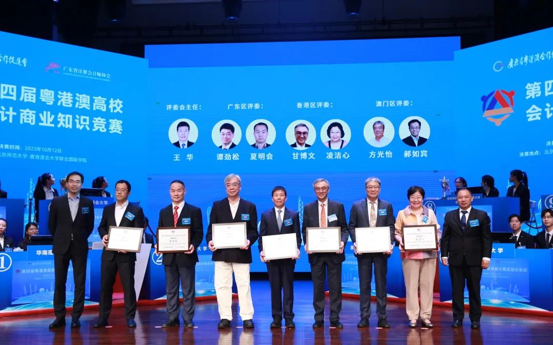 广东财经大学原校长王华、中山大学教授谭劲松、广州大学教授夏明会、香港财务汇报局前行政总裁甘博文、罗兵咸永道会计师事务所前审计合伙人凌洁心、澳门城市大学商学院副教授方光怡、澳门大学工商管理学院助理教授郝如宾担任本届竞赛的专业评委。王华教授在点评时表示:九支参赛队伍在比赛中展现了三地大学生专业性的高度、深度和广度,既涉及国家战略、大湾区建设和国际形势,又有对行业、企业的特性分析,除财务会计知识外,还对企业运营、营销、人力资源等方面都做出战略规划设想,展示出当代大学生的综合能力。
