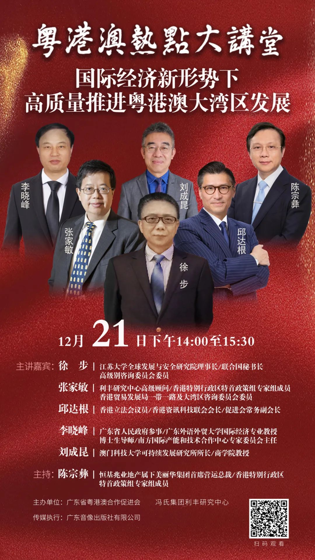 当前,国际形势日趋复杂且深度关联,呈现出多元化、复杂化、动态化的特点,在政治、经济、文化等多个领域,也正发生着深刻改变。面对当前复杂多变的国际形势,对于粤港澳大湾区高质量发展既是机遇也是挑战,为更好了解当下国际经济形势新格局,助力港澳积极融入国家发展大局,广东省粤港澳合作促进会联合冯氏集团利丰研究中心,将于12月21日(周四)下午14:00至15:30,在香港举办第十期《粤港澳热点大讲堂》,届时邀请北京和粤港澳三地有关专家学者和专业人士,围绕国际新局势的研判,从科创、数字经济、金融、民营经济等方面,共同探讨高质量推进粤港澳大湾区发展。本期活动将在广东省粤港澳合作促进会微信视频号、微赞平台同步播出,敬请关注。