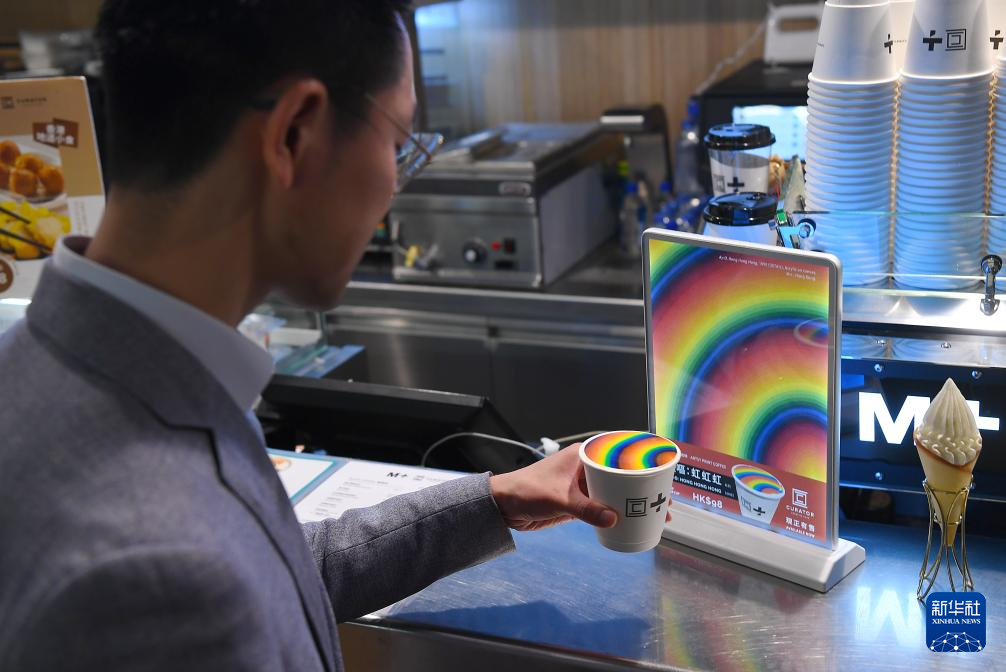 在香港视觉文化博物馆M+的咖啡店,市民李小姐惊喜地发现,这里竟然有一款彩虹咖啡,其图案色彩与前不久在此展出的日本彩虹艺术家的作品一模一样。得知这是经作者授权的艺术打印咖啡,李小姐立刻点了一杯,并开心地自拍留念。