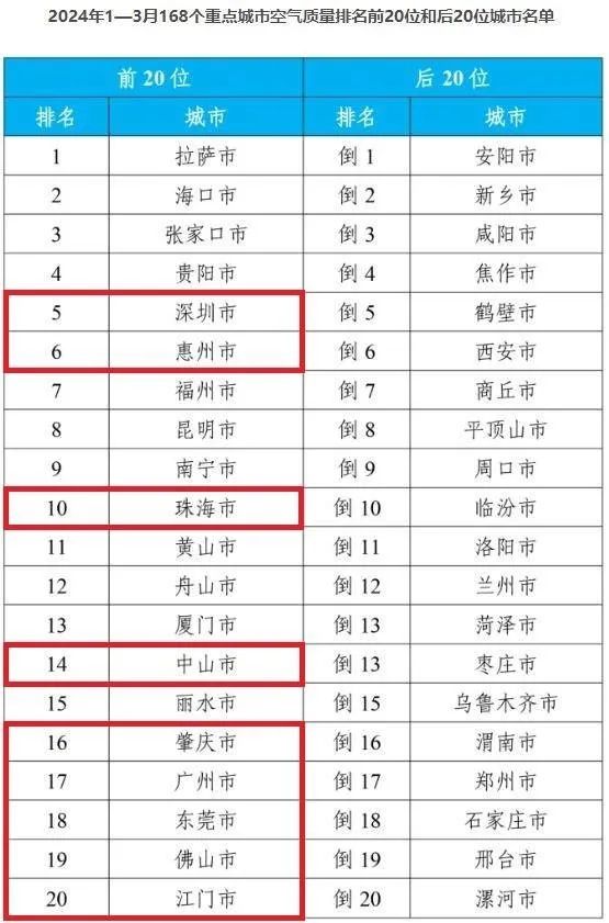 生态环境部通报了2024年3月和1—3月全国环境空气质量状况,在一季度全国重点城市空气质量前20名中,大湾区内地9市全部榜上有名,创下新的纪录。