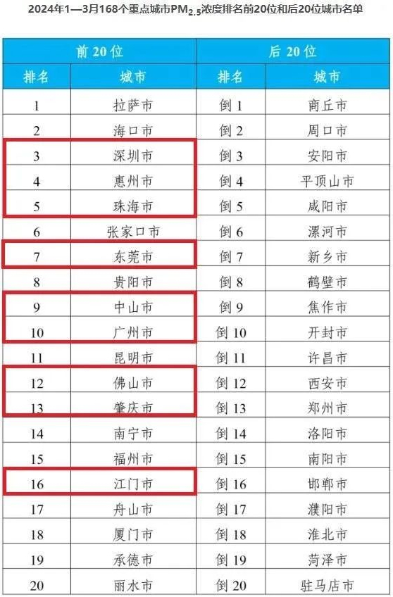 根据一季度168个重点城市PM2.5浓度排名,珠三角9市也都排进了浓度较低的前20名,且在前10名中占据了6席。