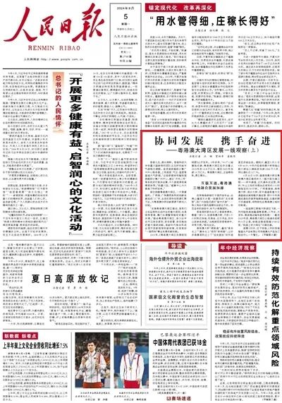 8月5日,《人民日报》头版刊发《协同发展 携手奋进——粤港澳大湾区发展一线观察(上)》。全文如下: