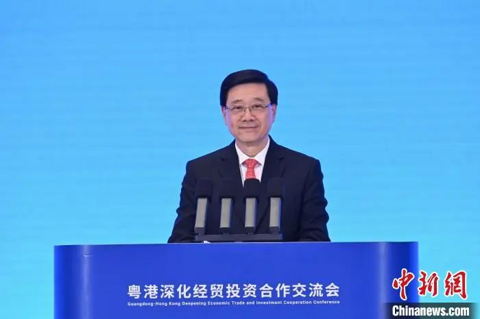 11月25日,香港特区行政长官李家超率领特区政府及工商界代表团到访广州。图为李家超在粤港深化经贸投资合作交流会致辞。