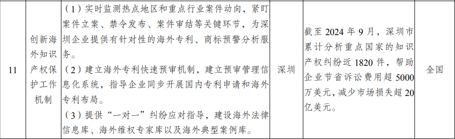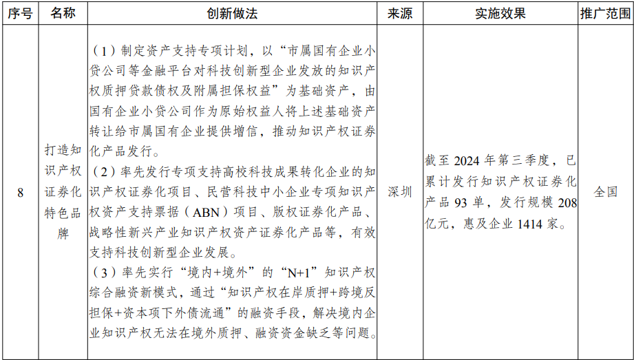 科技创新体制机制方面,主要涉及打造知识产权证券化特色品牌、创新海外知识产权保护工作机制等2项创新举措。