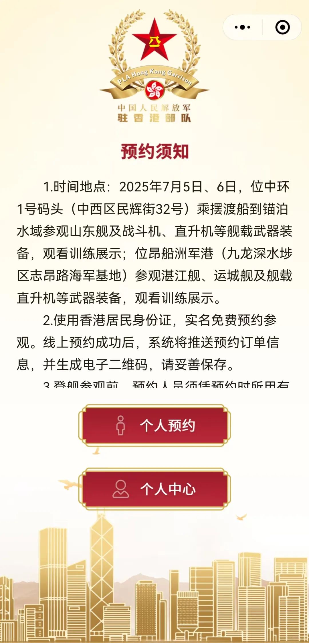 (三)安全检查与交通安排:市民须持参观票和个人身份证件,上午8时起位中环1号码头(中西区民辉街32号)接受安检,后搭乘驻香港部队统一安排的接驳船前往西面2号锚地登舰参观。