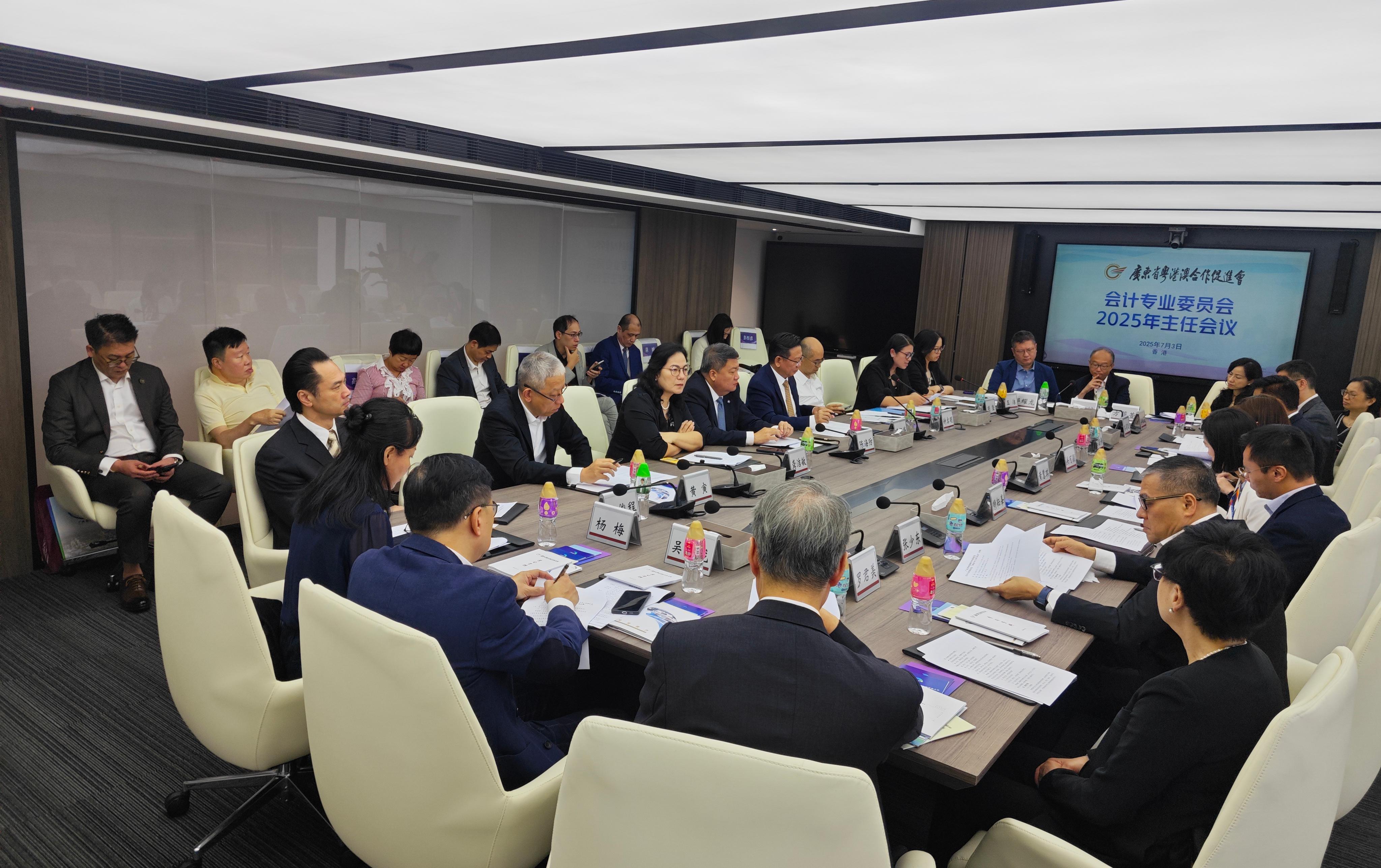 为深入贯彻落实省委、省政府关于高质量推进粤港澳大湾区建设的重要部署,进一步深化粤港澳三地会计专业领域交流合作,协同港澳专业人士,以创新理念,有序开拓会计专业委员会工作,广东省粤港澳合作促进会会计专业委员会(以下简称"会计专委会")于2025年7月3日在香港召开2025年主任会议。省委港澳办一级巡视员、促进会执行常务副会长黄锻炼,省委港澳办协调处一级调研员李俊程、促进会副会长、会计专委会香港区主任钟启明、澳门区主任张少东、广东副主任陈海防、澳门区副主任关可颖及专委会秘书长、副秘书长、委员等代表共30人出席。