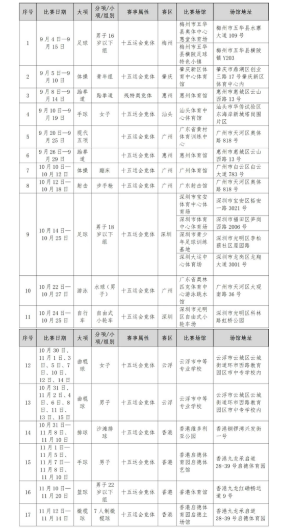 首批17个项目门票将于8月28日开售,从9月4日在梅州进行的足球对决到11月14日在香港启德体育园收官的7人制橄榄球比赛,覆盖广东、香港多地的多座场馆,赛程、场馆地址、赛事属性等信息一目了然。