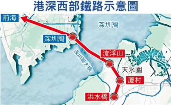 据了解,港深西部铁路连接香港洪水桥及深圳前海,由香港洪水桥站出发,在厦村及流浮山设车站,跨越后海湾经深圳湾再接驳深圳前海,全长约18公里,香港段长约8公里,开通后由香港北部都会区直达深圳前海仅需15分钟。