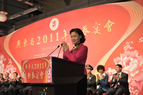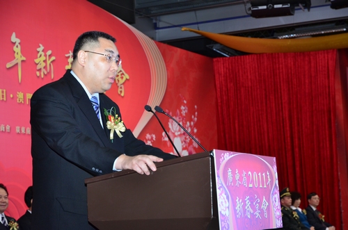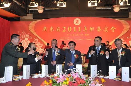 2011年2月15日,广东省2011年新春宴会在澳门隆重举行。省长黄华华率广东省代表团出席并发表主旨演讲,澳门特别行政区行政长官崔世安、中央政府驻澳联络办主任白志健致辞。全国政协副主席何厚铧,外交部驻澳特派员公署特派员卢树民,中国人民解放军驻澳部队司令员祝庆生、政委许进林,中央政府驻澳联络办副主任徐泽、李本钧、高燕、陈启明,以及省领导周镇宏、钟阳胜、汤炳权等出席了新春宴会。宴会由副省长招玉芳主持。中央驻澳有关机构,澳门特别行政区政府,广东省政府有关部门和21个地级以上市政府、各中资机构,澳门社会各界知名人士代表,粤籍社团代表共900多人参加了宴会。本次活动由广东省人民政府主办,广东省粤港澳合作促进会、澳门中华总商会和南粤集团共同协办。