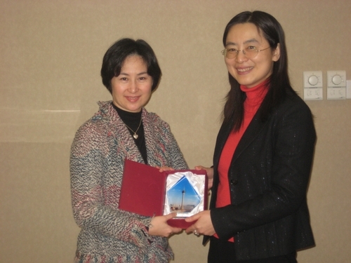 金萍副主任与促进会名誉常务理事澳门旅游娱乐有限公司董事何超琼女士互赠纪念品