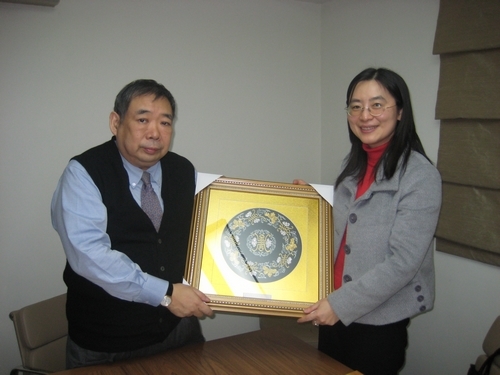 金萍副主任与促进会名誉副会长澳门中华总商会副会长崔世昌先生互赠纪念品