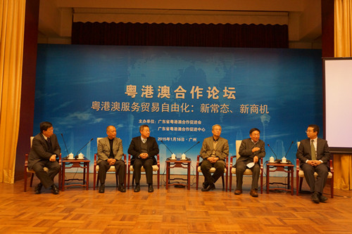 2015年1月16日以“服务贸易自由化—新常态、新商机”为主题的粤港澳合作论坛于广州举行。本次论坛由广东省粤港澳合作促进会及广东省粤港澳合作促进中心联合主办。国家商务部姬文林处长、广东省社科院院长王珺,全国政协委员、香港特区政府中央政策组特邀顾问张家敏,澳门经济建设协会理事长杨道匡,罗斯柴尔德集团中国区主管张江亭分别作了精彩演讲,粤港澳三地专家、学者和各业界代表逾三百人出席。